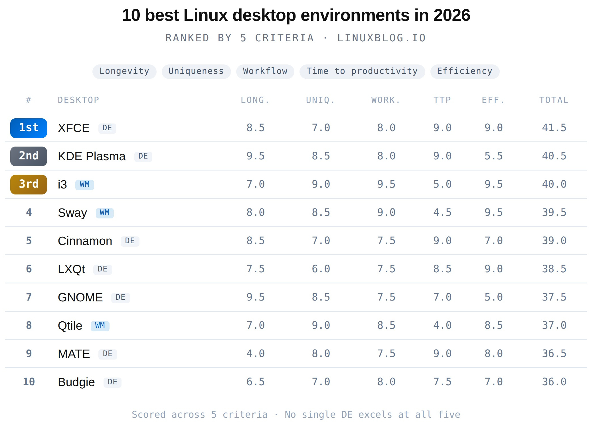 XFCE doesn’t dominate any single category. Look at the table. It ties for the top TTP score but doesn’t lead outright in longevity, uniqueness, workflow, or efficiency. And yet, it’s #1 overall. That tells you everything about what this ranking values: consistency.