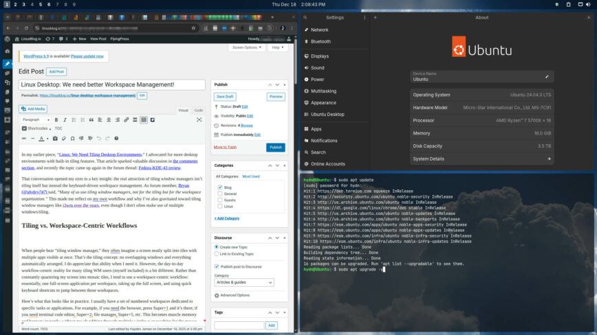 That conversation opened my eyes to a key insight: the real attraction of tiling window managers isn’t tiling itself but instead the keyboard-driven workspace management. As forum member, Bryan (@shybry747) said, “I remember DT on YouTube put it best, many of us use tiling window managers, not for the tiling but for the workspace organization.” This made me reflect on my own workflow and why I’ve also gravitated toward tiling window managers like i3wm over the years, even though I don’t often make use of window tiling.