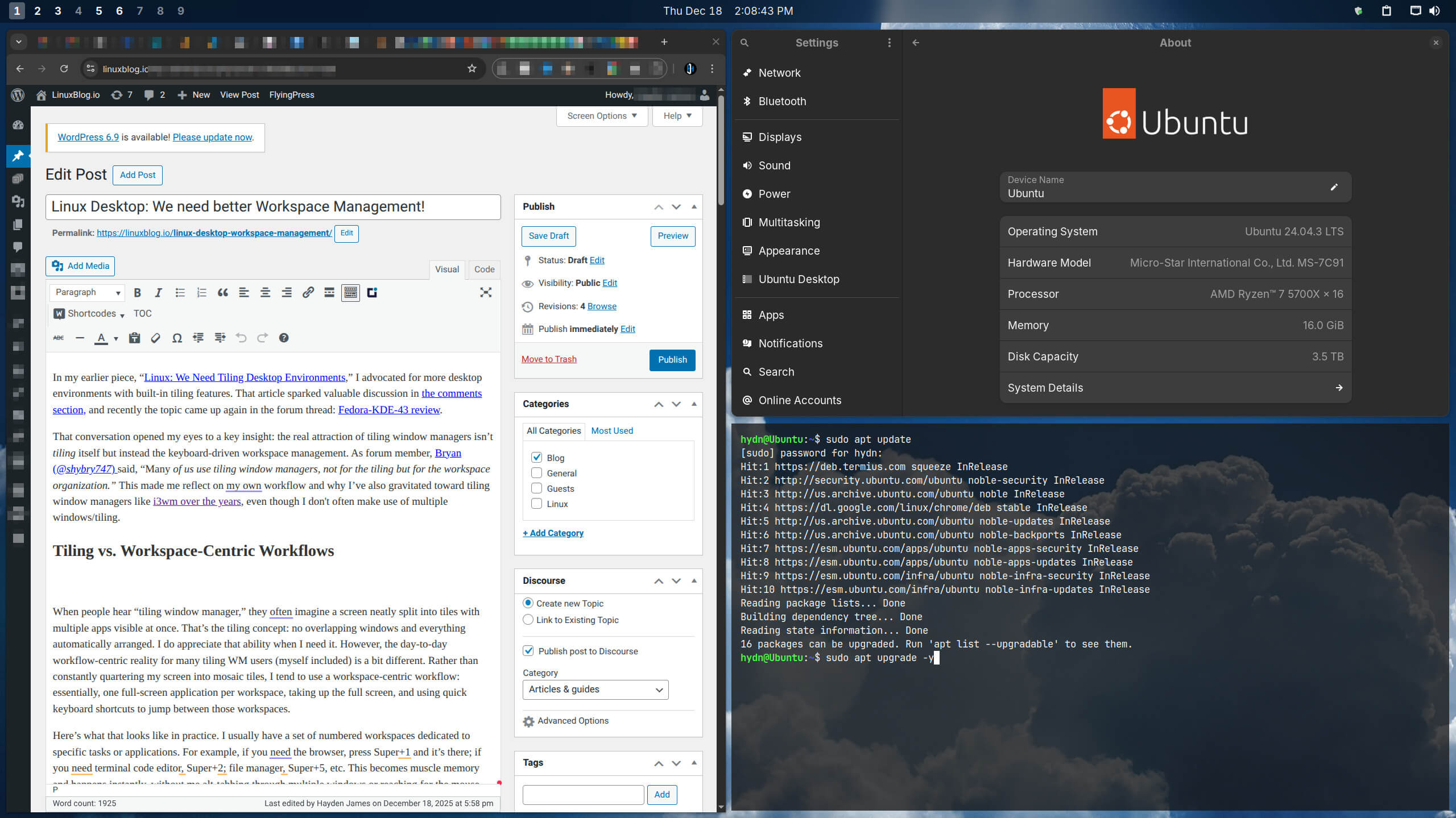 The tiling aspect still plays a role, but often it’s secondary. Most of the time, each workspace only has one window open (full-screen by default). I only tile multiple windows side-by-side when I specifically need to, such as when following a tutorial in a browser while typing commands in a terminal on the same screen. In those rare cases, I might split the screen between two or more apps. But once I’m done, I usually go back to one-window-per-workspace.