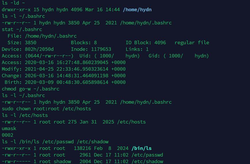 That orphaned file check is useful after removing a user account. Files that belonged to a deleted UID show up as numeric IDs in ls -l output. Clean them up or reassign ownership.