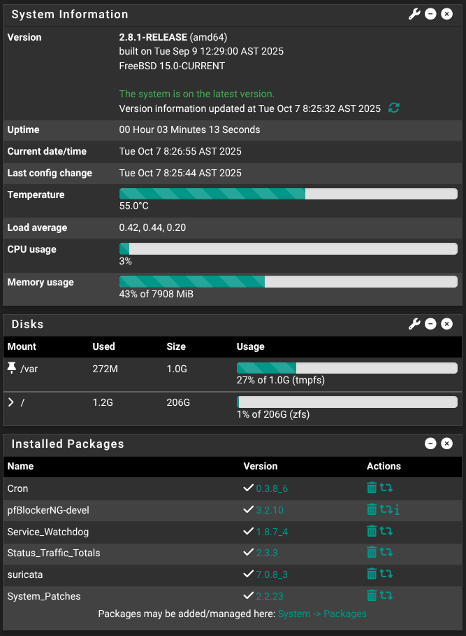 That order matches how I triage problems: WAN up? → services up? → any blocks or alerts? → bandwidth normal? With the dashboard tuned this way, you land on pfSense, skim, and move on—no extra clicks needed.