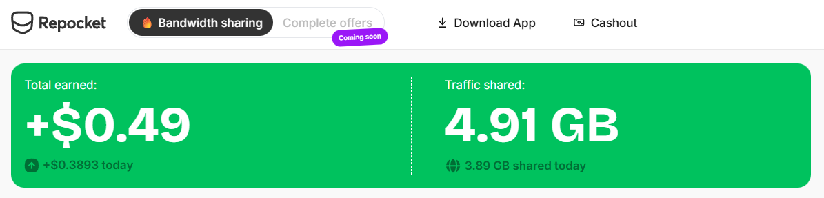Since the demand is lower in my Caribbean location, I started also using repocket.com while writing the article, so ~ 5 days now. Bandwidth usage is low, but like the others, I belive over time, when their systems detect that my connection has great uptime, the demand will increase: