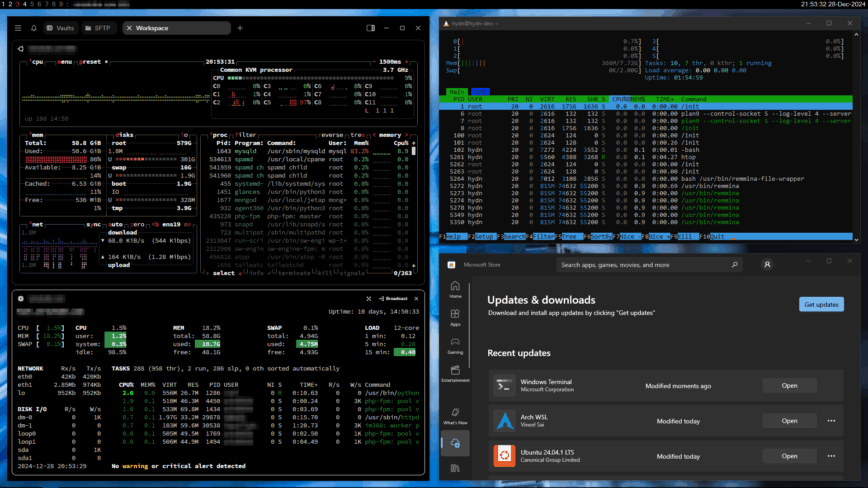 To make Windows feel more like my familiar Linux environment, I installed tiling window managers such as Win3WM and later Komorebi. I used AutoHotkey and custom keybindings to replicate the i3 workflow, and relied heavily on the Windows Subsystem for Linux (WSL) to run Linux command‑line tools. WSL2 allowed me to install Kali, Debian, and Arch distributions and even run GUI apps directly from Windows Terminal. In the Part 2 article, After 10 Years of Linux, I Switched to Windows. Part 2: Still Use Linux via WSL, I described how WSL2 helped me unite Windows and Linux, allowing both environments to run side‑by‑side.